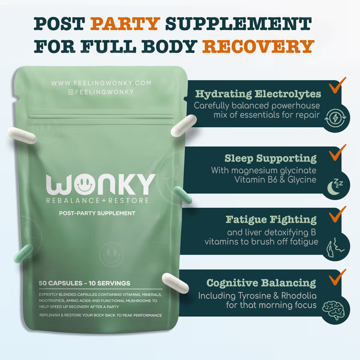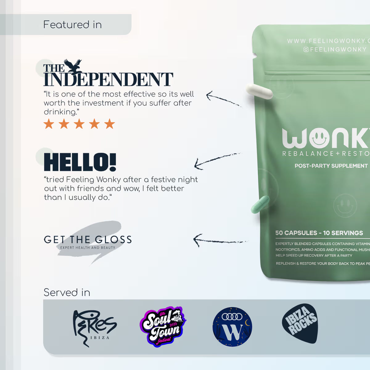 Don't let the night hold you back. Feeling Wonky's unique 2 stage formula ensures you get the most out of every social occasion, helping you feel refreshed and focused before the post-party blues can take your day. -